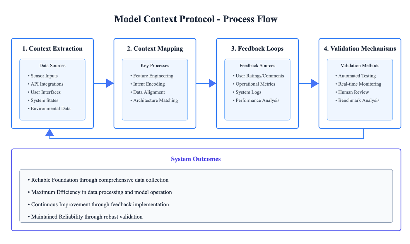The process flow of the Model Context Protocol (MCP) highlights how data moves from extraction to validation while minimizing human error. Each stage, extraction, mapping, feedback, and validation- ensures data accuracy, regulatory compliance, and operational efficiency.