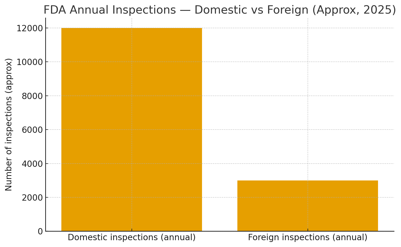 • The FDA has indicated it conducts roughly 12,000 domestic inspections and about 3,000 foreign inspections annually. The agency has also expanded the use of unannounced inspections at foreign manufacturing sites. This expansion increases the chance that any given foreign facility may receive an unannounced visit.